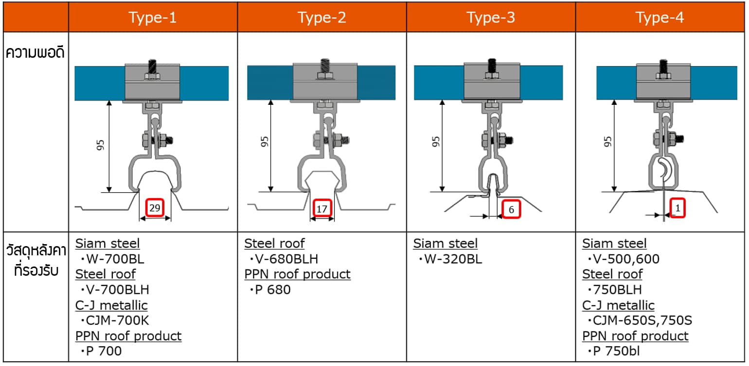 *PV Panel clamp มีขอบเขตการใช้งานที่แตกต่างกัน ทั้งนี้ขึ้นอยู่กับสภาพของวัสดุหลังคาและเงื่อนไขการติดตั้ง (ความสูง ภูมิภาค เป็นต้น)