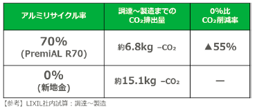 Quantifying the environmental impact of building materials through Life Cycle Assessment (LCA) supports the reduction of CO₂ emissions during construction and the advancement of reduction plans by adopting companies. The "PremiAL R70" introduced this time is LIXIL's original circular low-carbon aluminum profile that enables the quantitative demonstration of the environmental impact of building materials used in construction. The CO₂ emissions in the manufacturing process of "PremiAL R70" contribute to a reduction of approximately 55% compared to when aluminum profiles without recycled materials are used.